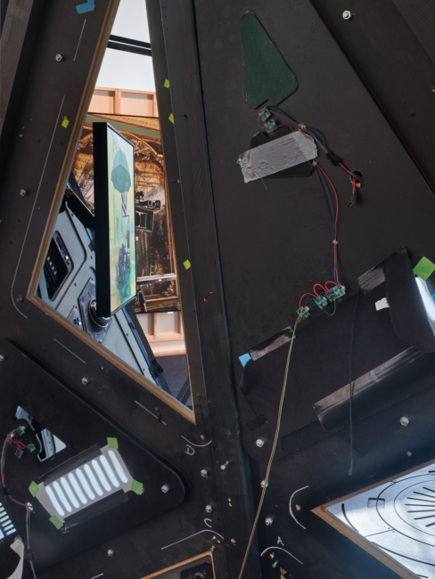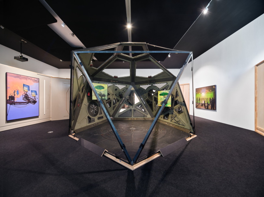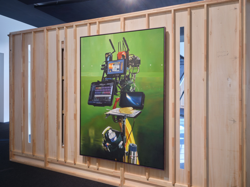 Basierend auf Fotografien und Zeichnungen, die Thie an Filmsets angefertigt hat, rücken die Gemälde von Geräten und Apparaturen, sie sich sonst hinter der Kamera befinden, ins Zentrum. Die Ausdehnung des Narrativs, das auch die Technik hinter den Kulissen miteinbezieht, spielte bereits in früheren Arbeiten Thies eine wichtige Rolle. Mit Studio treibt die Künstlerin dies auf die Spitze: Die ganze Welt ist eine Bühne, selbst die Kulisse wird zur Protagonistin. Im Raum treffen Malereien und Filmset aufeinander: Sie reinszenieren die Dramen vor und hinter der Kamera, während ihre entrückte Platzierung das ursprüngliche Narrativ der Kulisse bewusst stört. Sie erzählen nicht nur von der Technik selbst, sondern auch von der unsichtbaren Arbeit und den Schatten der Produktion hinter der Fiktion, die sonst erst mit dem Abspann sichtbar werden.