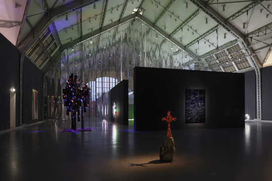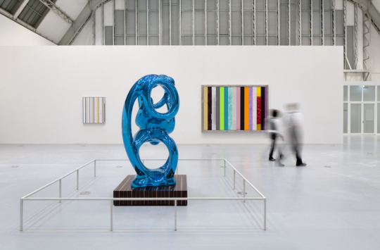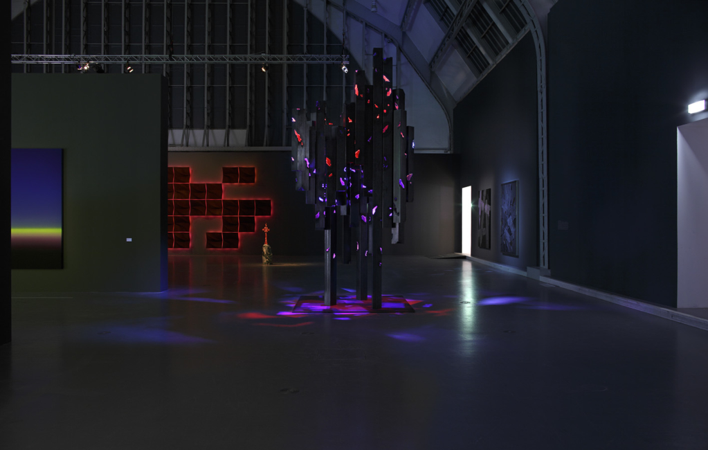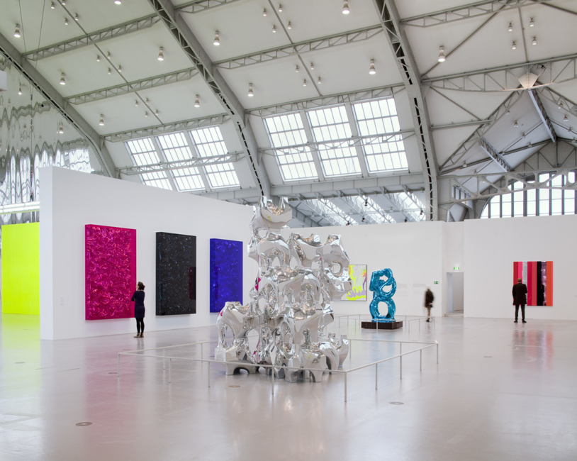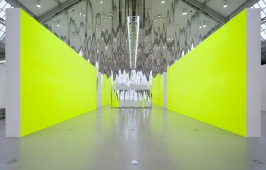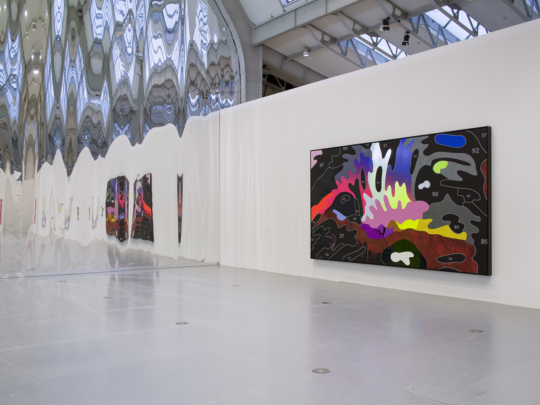 Reyle meets this challenge by separating the 3.200 qm large North Hall into two different sized areas: Like a curtain, a wall made of silver foil separates a room illuminated with natural light from a dark room. He shows a typical selection of his paintings, which are based on each other in their conceptual development, such as stripe paintings, gestural works, various foil paintings to recent works following the »paint-by-numbers« principle. From his sculptural oeuvre, along with the so-called »African« sculptures made from colored mirrored bronze, including »Eternity«, are some earlier sculptural objects such as his neon yellow hay wagon, a delicate neon light installation, the current conception of his sculpture „Philosophy“ based on architectural elements and a wall relief lit by LEDs.