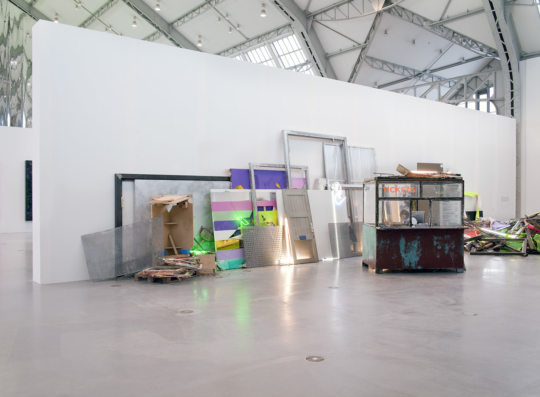 In spite of the wide spectrum of material and form, these haptic-visual works oscillating between architecture and sculpture are combined coherently. Reyle's exhibits in the main room are subject here to a double reflection: They are not only mirrored distortedly in the foil walls, but also against each other in the repeated use of a specific formal language and an artistic material repertoire using found objects from the urban field and trash from »low culture«. He confronts this with art-historical adaptations of the »high art« of the 20th Century, such as Pop Art, Minimalism, Abstract Expressionism, Hard Edge painting and presents them equally as divergent motif-historical sources.