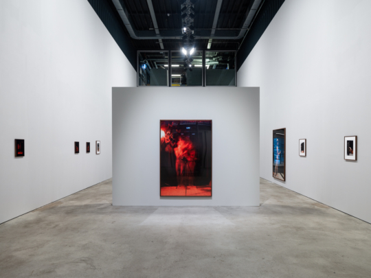 In contrast to this self-reflexive and symbolic nature of the Daylight Studio works, Sepuya's Dark Room Studio photographs emphasize the formal and technical elements of photography. Many of the Dark Room Studio works are illuminated only with red safety lamps, thus making the depicted bodies appear almost like distortions in their movements and interactions in the images, some of which are barely visible and are created by an extended exposure time of several seconds. In this way, they are reminiscent of early daguerreotypes or photo-historical studies such as Eduard Muybridge's Motion Studies - of everything that was not captured on plates, negatives and prints - and of the possibilities of creating references between present and past times. The images produced by dye-sublimation printing are unreproducible and unique.