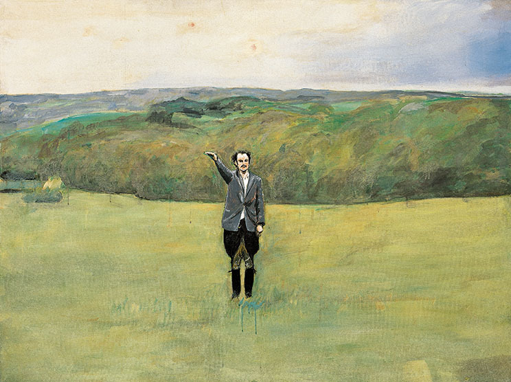 Das ist richtig. Zum Beispiel Polke mit seinen wunderbar humorvollen Reflektionen darüber, wie das deutsche Heim in der Wirtschaftswunder-Ära eingerichtet war: mit dem Dürer-Hasen, den gemusterten Dekostoffen oder den exotischen Flamingos. Interessant auch, wie Polke die moderne Kunst gegen sich selbst ausspielt, wie etwa in dem Bild »Höhere Wesen befahlen: rechte obere Ecke schwarz malen!«. Das schwarze Dreieck erinnert nicht nur an konkrete Kunst, sondern auch an Hitlers typische Frisur. Das ist sehr raffiniert und tut gleichzeitig weh. Polke ist ein Meister der Ironie. Die Medienreflektion in seinen Rasterbildern kann man auch mit der fotobasierten Malerei von Gerhard Richter vergleichen. Darin unterscheiden sich beide von den expressiveren Ansätzen, die man in den Werken von Baselitz und Kiefer findet. Das Schürfen in der Vergangenheit verbindet letztere, etwa auch ihr Bezug zur Landschaft. Baselitz‘ gebrochene Helden, abgerissene Gestalten, die verloren in einem ruinierten Niemandsland herumstehen, sind das Gegenteil der Heldendarstellung des Dritten Reiches.