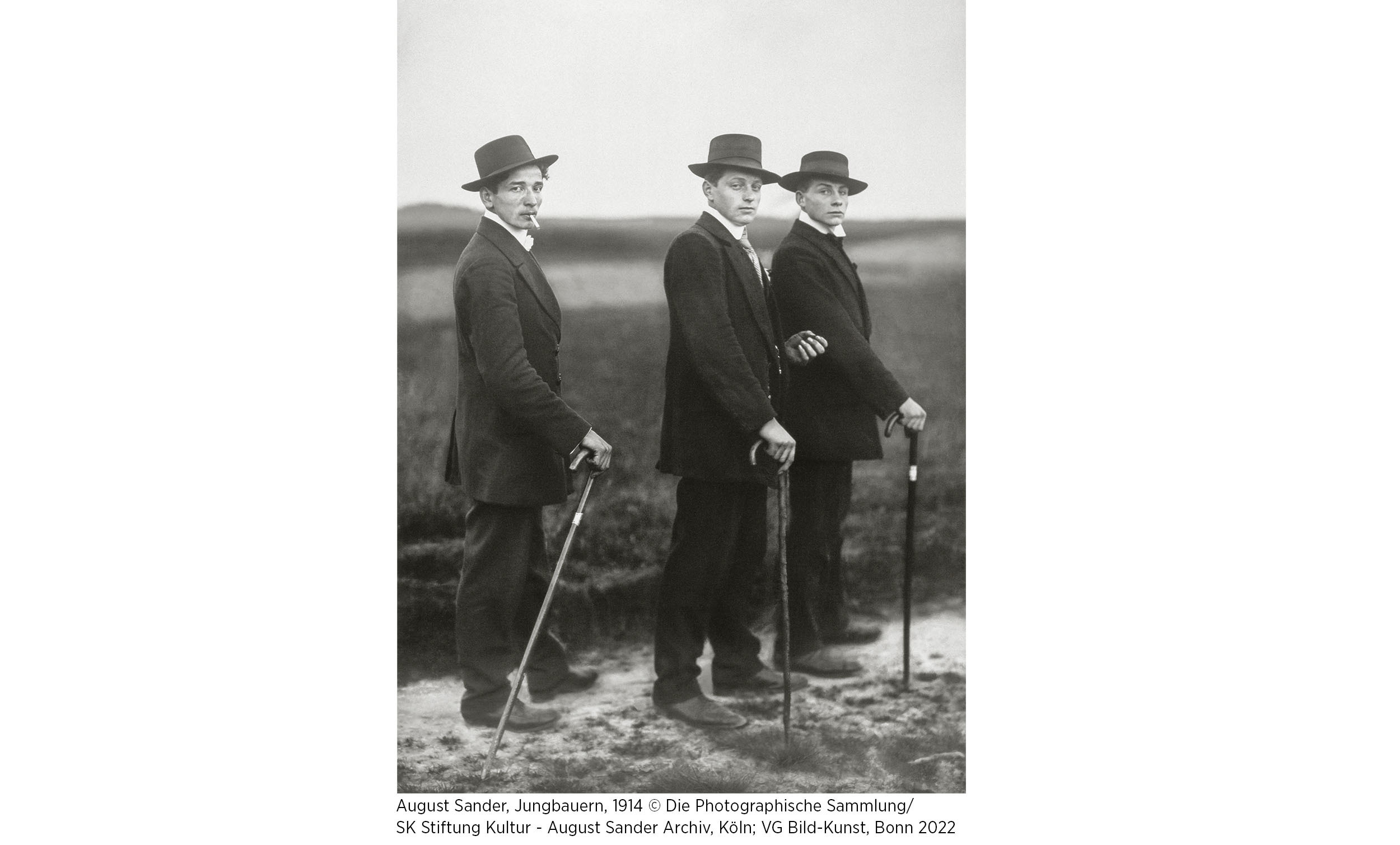 Längst haben sich zahlreiche der von August Sander (1876-1964) aufgenommenen Porträts in das kollektive Gedächtnis unserer Tage eingeschrieben: Konditor, Hirte, Handlanger, Architekt, Boxer sind nur einige Titel von Sanders bekannten Fotografien, wobei das Porträt der drei Jungbauern, die im Film von Omer Fast vorkommen, ganz sicher seine bekannteste Aufnahme ist. Alle genannten Fotografien waren in seinem Bildband Antlitz der Zeit von 1929 enthalten und gehören zu seiner ambitionierten Porträtserie Menschen des 20. Jahrhunderts, an der er seit Mitte der Zwanzigerjahre arbeitete. Sanders Ziel war es, nichts weniger als die gesamte Gesellschaft der Weimarer Republik im Porträt festzuhalten.