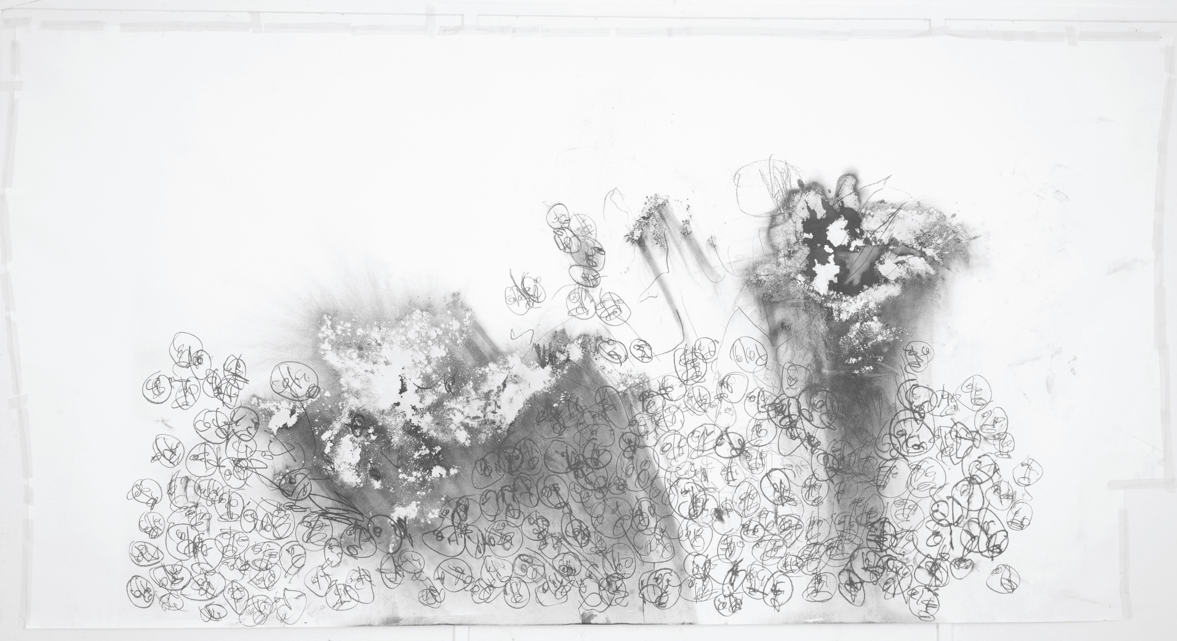Eine Arbeit hat es mir besonders angetan: Eine riesige, querformatige Graphitzeichnung auf Papier, die aus vielen gestischen Kringel-Kritzeleien besteht. Man kann diese Arbeit als Partitur lesen, oder als Gruppe von Menschen, als besetzten und als unbesetzten Raum. Den Akt des Zeichnens hat Daniel Blumberg mit zwei Kameras filmen lassen, und dieses Making-of verwurstete er wiederum anschließend in ein Musikvideo zu seinem Song Minus, dem Titelsong seines gleichnamigen, im Sommer diesen Jahres auf Mute erschienenen Debütalbums.
