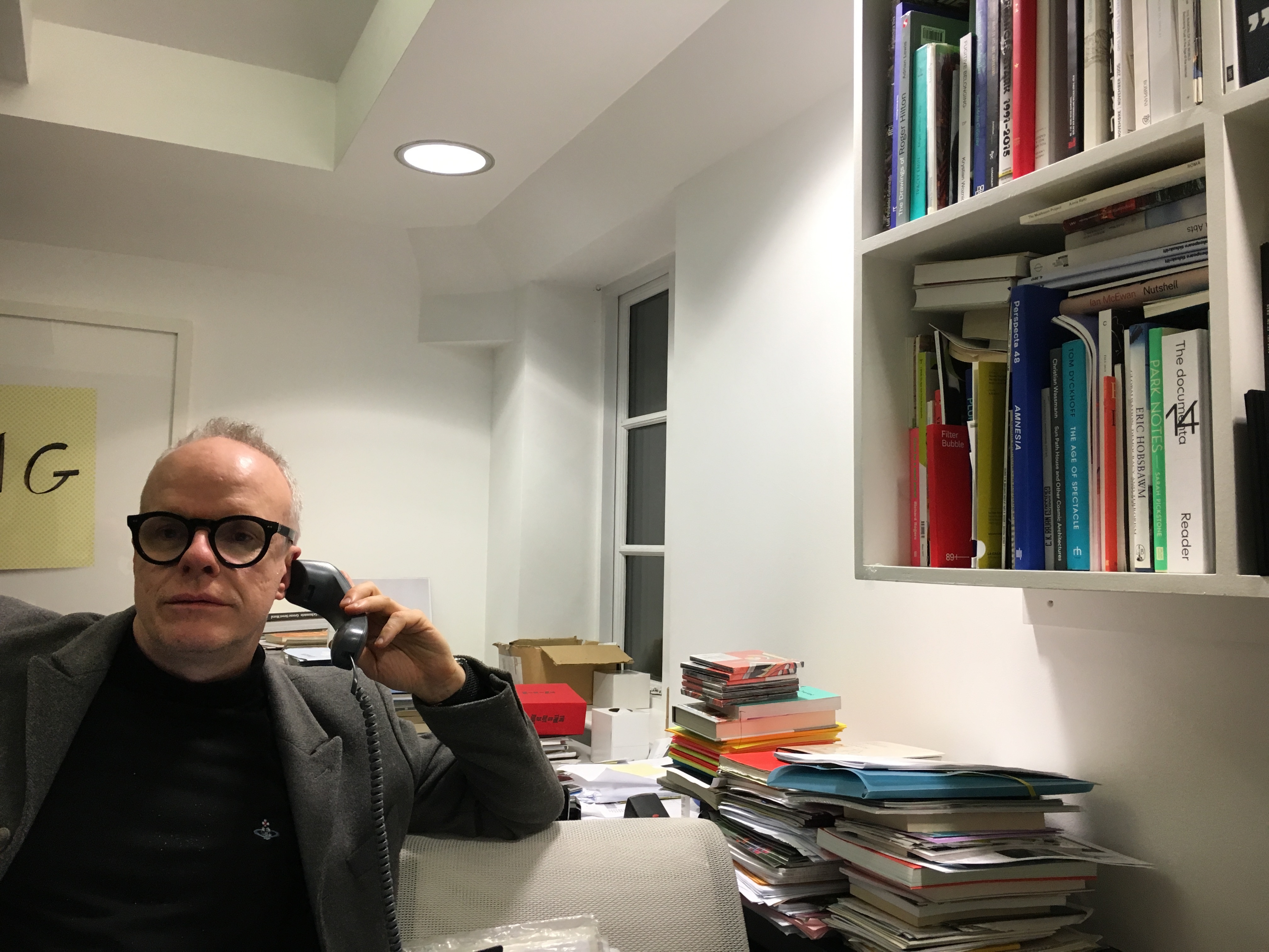 Zerknitterter, grauer Anzug, weißes Hemd, Sneakers, teurer Füllfederhalter. Ein kleiner Tisch wird in einem Tal des Kartonmassivs freigeräumt, das digitale Aufnahmegerät der Marke Olympus legt er auf den Deckel eines herumliegenden, von Obrist herausgegebenen Interviewbuches mit Thomas Demand, Band #10 der Reihe The Conversation Series.«