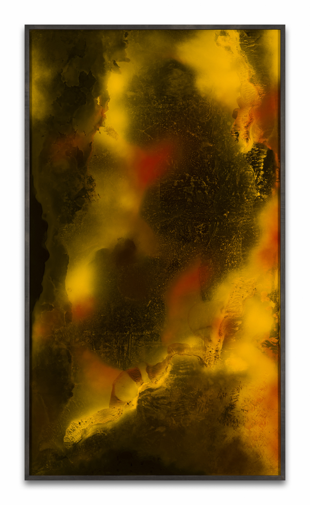 Ein anderes Millenial ist die Berliner Malerin Bettina Scholz, die, wie jede an der Ausstellung teilnehmende Künstler*in für einen eigenen Ansatz im weiten, ausufernden Feld der gegenseitigen Beeinflussung von Kunst und Musik steht. Ihr Ansatz ist synästhetischer Natur, außerdem liegen ihren Gemälden stets Vorbilder oder, wie sie es nennt, »Wahlverwandtschaften« aus anderen Disziplinen zugrunde. Bettina Scholz malt Bilder, die wie alchemistische Farbschüttungen sind. Viele Betrachter*innen sehen in diesen Bildern apokalyptische Motive, so assoziationsreich sind ihre Abstraktionen, die sie stets hinter Glas rahmt. Durch die Distanzebene des Glases und die daraus resultierenden Spiegelungen, aber auch durch die Verwendung kräftiger, leuchtender Farben, erinnern Bettina Scholz’ Gemälde oft an überformatige Smartphones oder Tablets, gigantische Hinterglas-Bildschirme.