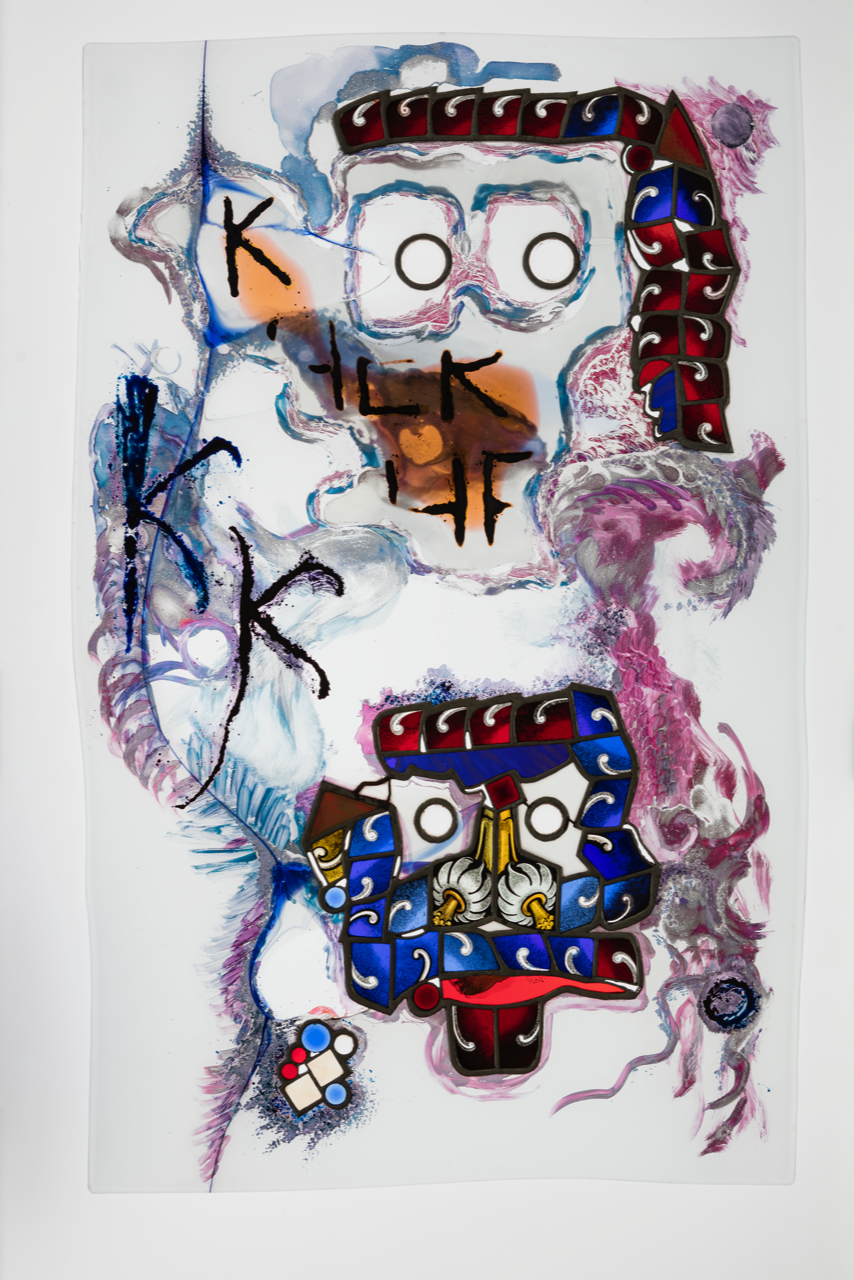 Towards an Alphabet (Dino Runes) weist daraufhin, dass es sich um ein Hinbewegen zu einer Sprache handelt, zur Sprache der Malerei gewissermaßen. Ich sehe die Dinosaurier wie aufeinandertreffende abstrakte Runen, wie prähistorische Schriftzeichen also, die sich in Richtung eines neuen Alphabets bewegen. Diese Arbeit ist Bildträger für die anderen Objekte. Jedes dieser Objekte setzt sich wiederum anders mit dem Medium Malerei auseinander und adressiert einen anderen Fokus meines malerischen Interesses, sei es die Simulation einer Versteinerung (Stucco Marmo), die Entwicklung eines talismanischen Malerei-Objektes (KAYA) oder das Erforschen einer durchlässigen Materie (Glasmalerei). Wobei ich mich auch hier gefragt habe: Wie kann ich die Malerei einem Stresstest aussetzen?