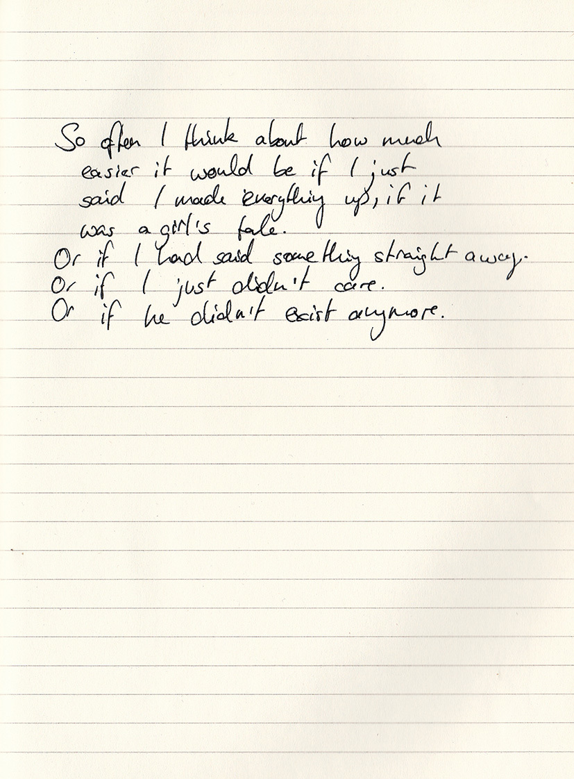 Ich fühle mich mit dieser künstlerischen Form viel wohler. Das ist auch der Grund für die Wirkungskraft, die mein Buch offenbar hat. Durch die Fotos versteht man die Gefühlswelt eines missbrauchten Kindes. Ich glaube, es gibt bestimmte Bereiche, da reicht Sprache nicht aus. Letztendlich verlief auch der Arbeitsprozess so, dieser Kombination aus Schreiben, Fotografieren, Zerreißen. Wenn ich auf der einen Ebene nicht weiterkam, bin ich in eine andere gewechselt.