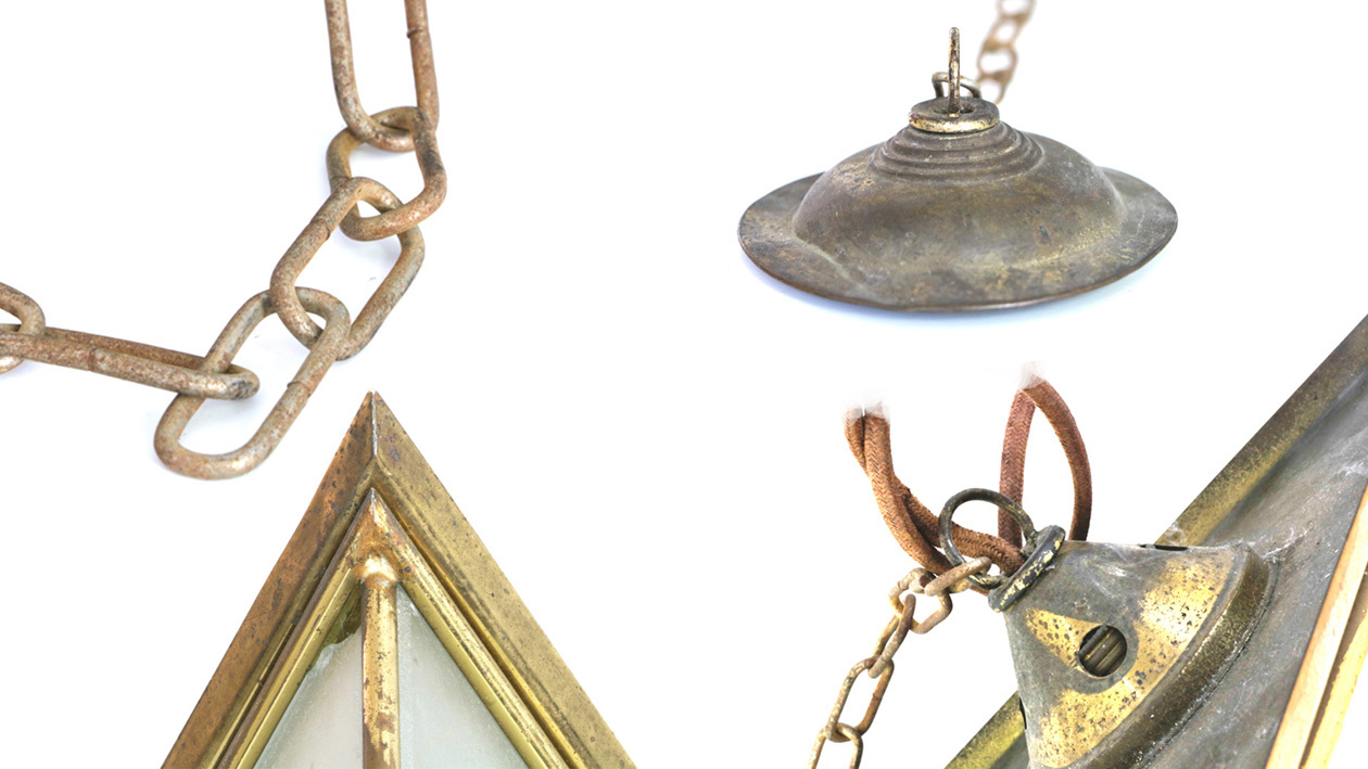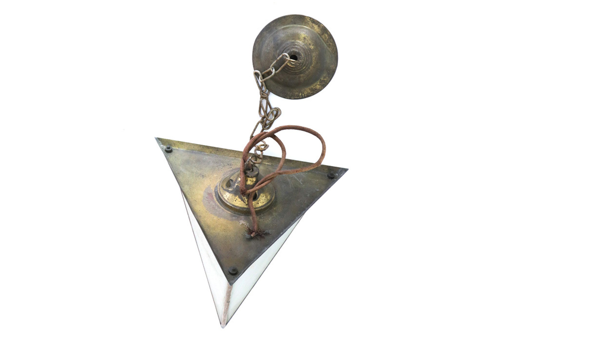 Nehmen wir zum Beispiel dieses Ding – eine Lampe: tetraedrische Form, Messing, Mattglas, ein textilumwickeltes Kabel, leicht angestaubt. Vielleicht schon viele Jahre nicht mehr im Einsatz. Wir jedenfalls können diesem Dingesdrang nicht widerstehen, sich uns zu zeigen und uns zu berichten, welch unwahrscheinliche Begebenheiten sie im Laufe ihrer Lampenexistenz in ihr schummriges Licht gehüllt hat.