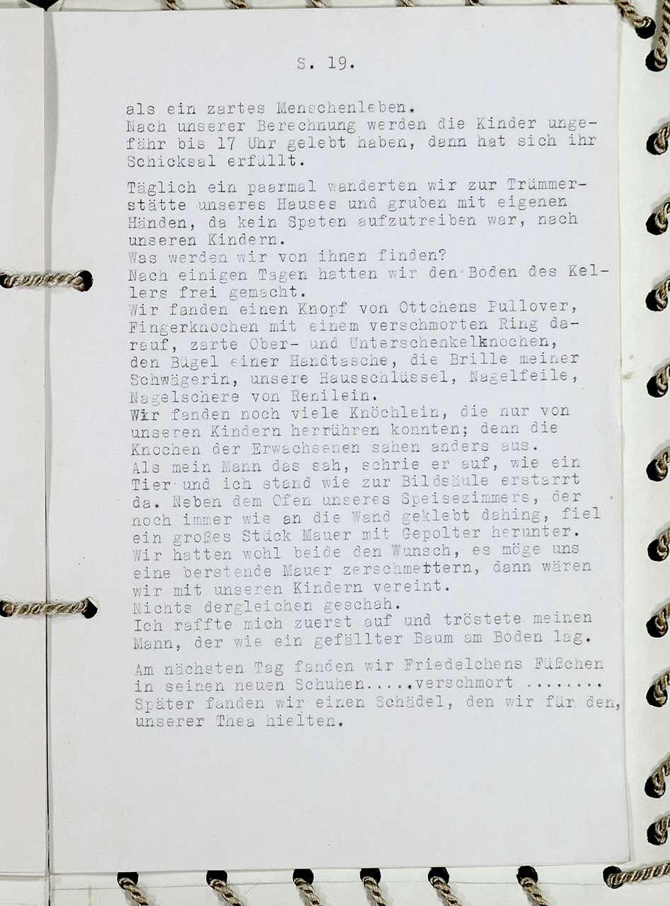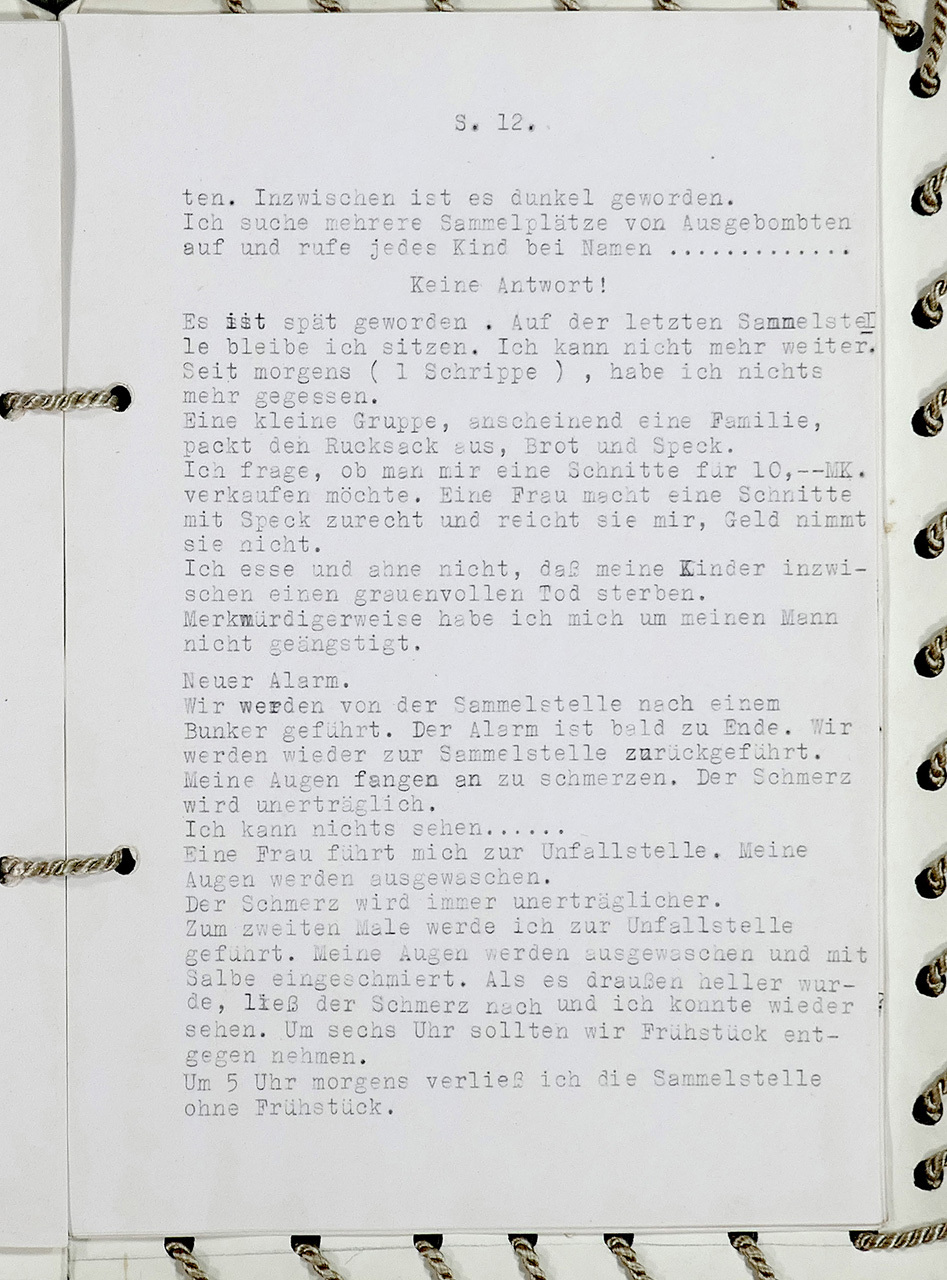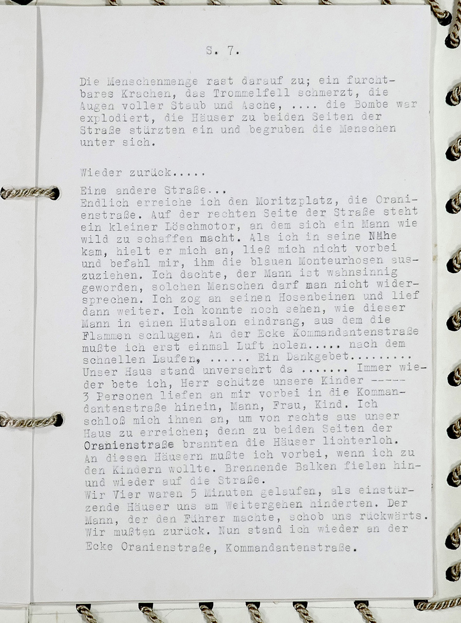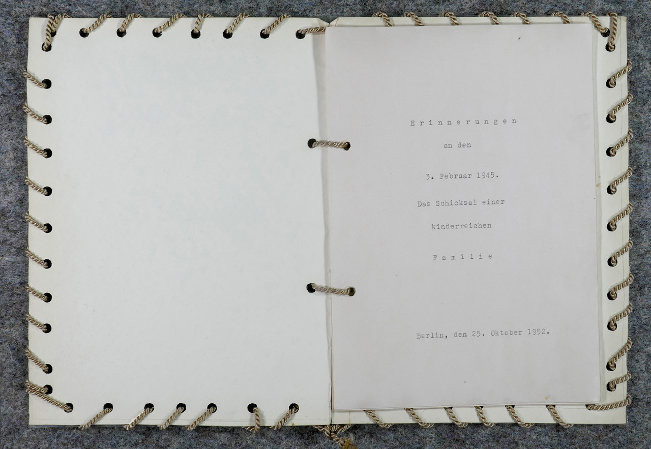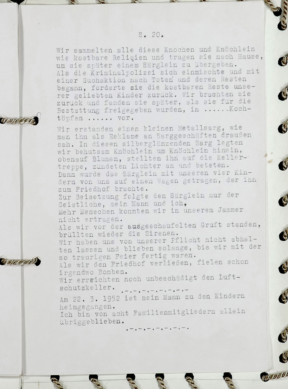 Auf der Suche nach einem klassischen Holz-Aktenschrank mit Rolltür wurden reproducts-Mitarbeitende 1997 im Zille-Hof Berlin fündig. Im Boden des Aktenschrankes fand sich später dieses Heft. In dem 1952 verfassten Bericht schildert eine Mutter, wie sie bei dem Bombenangriff vom 3. Februar 1945 auf Berlin alle ihre Kinder verliert.