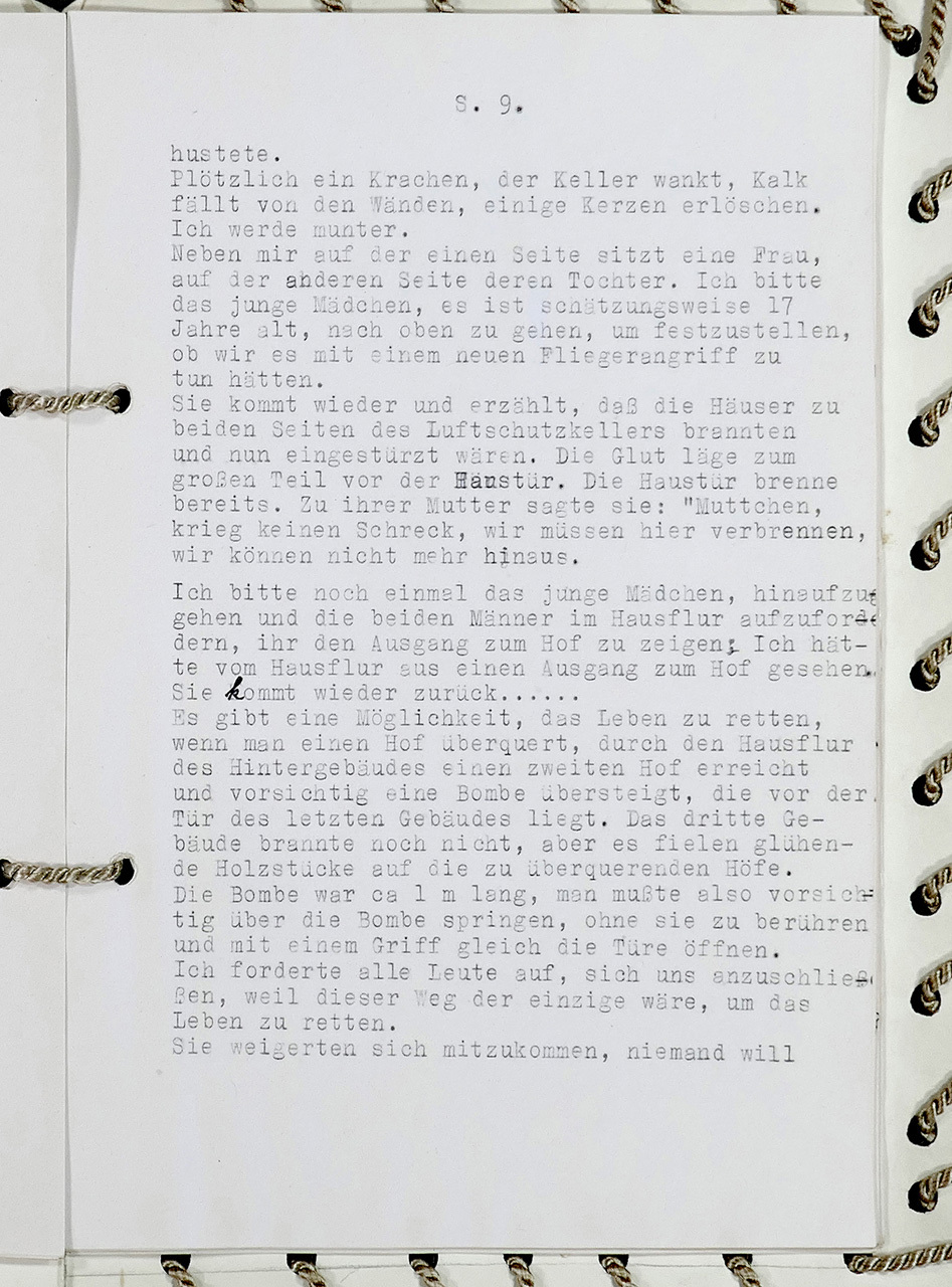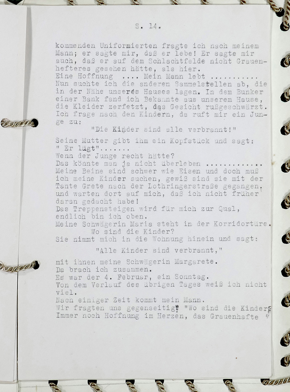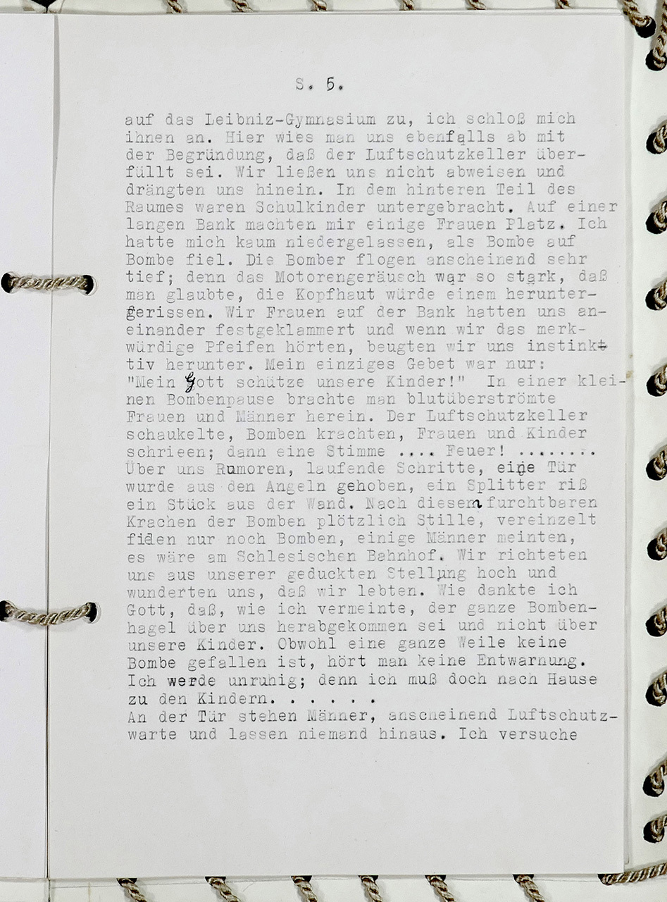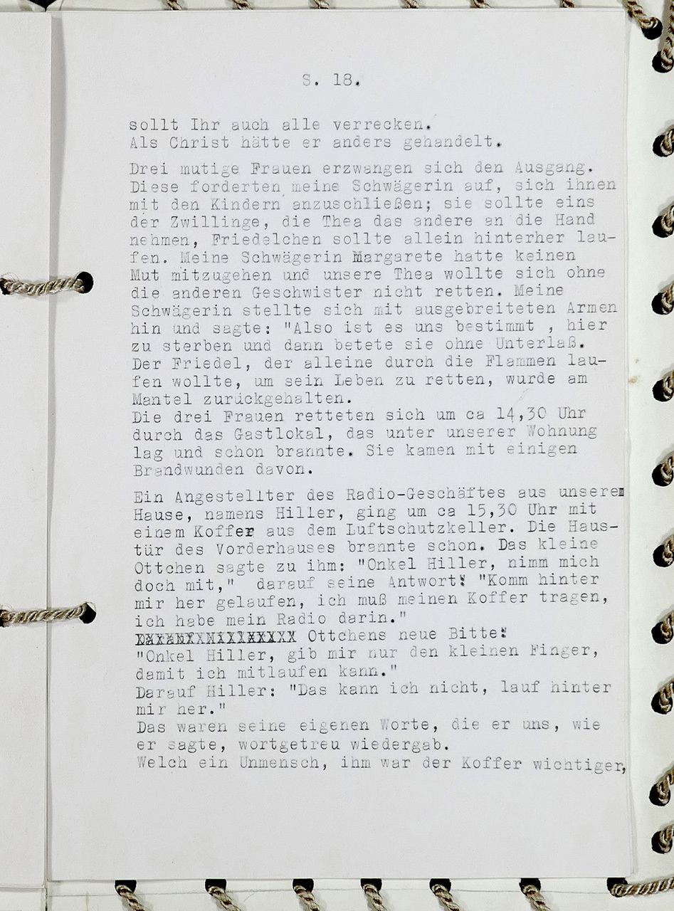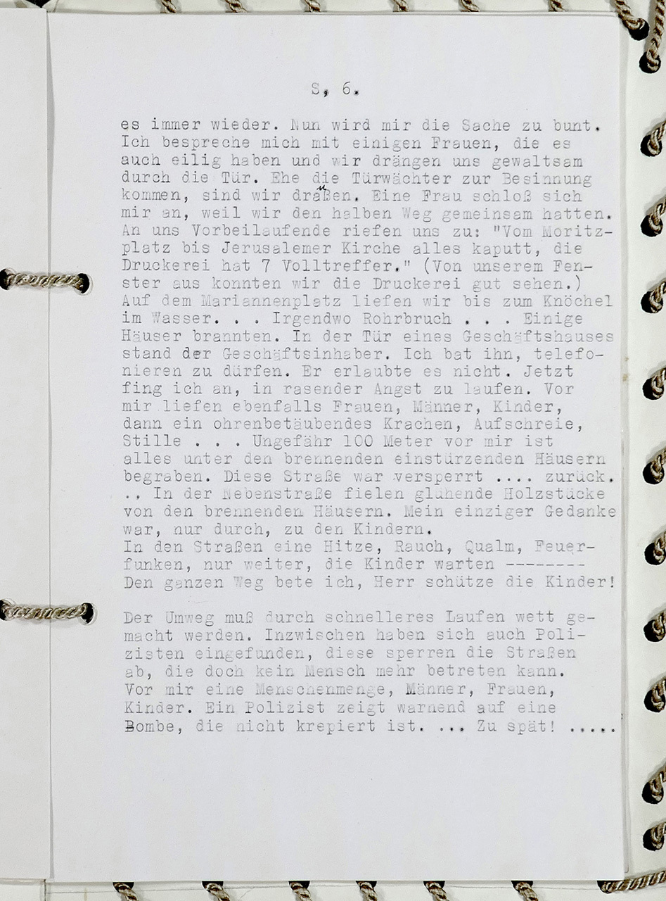 Auf der Suche nach einem klassischen Holz-Aktenschrank mit Rolltür wurden reproducts-Mitarbeitende 1997 im Zille-Hof Berlin fündig. Im Boden des Aktenschrankes fand sich später dieses Heft. In dem 1952 verfassten Bericht schildert eine Mutter, wie sie bei dem Bombenangriff vom 3. Februar 1945 auf Berlin alle ihre Kinder verliert.