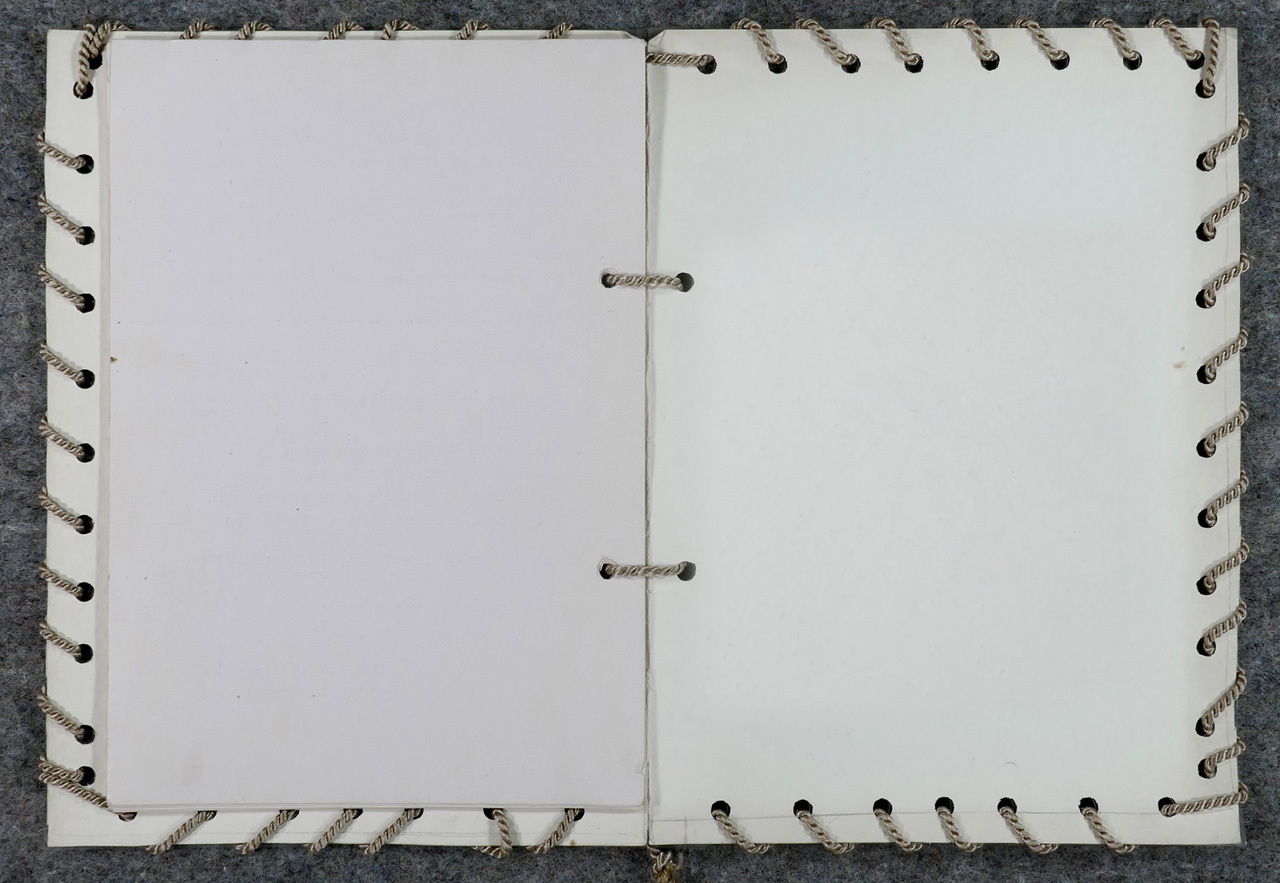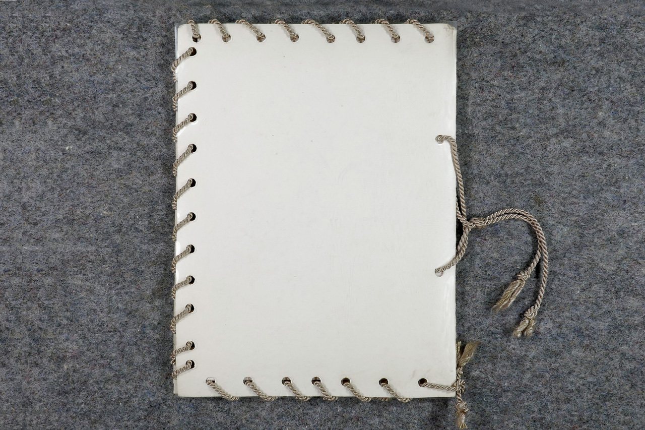 Beschreibung: mit goldbeigefarbener Kordel in Plastfolie eingebundene Papp- und Papierseiten, Papp-Umschlag mit Tusche bemalt, Papier mit Schreibmaschine beschrieben, Maße 22,7 x 16,5 x 0,4 cm (HBT)