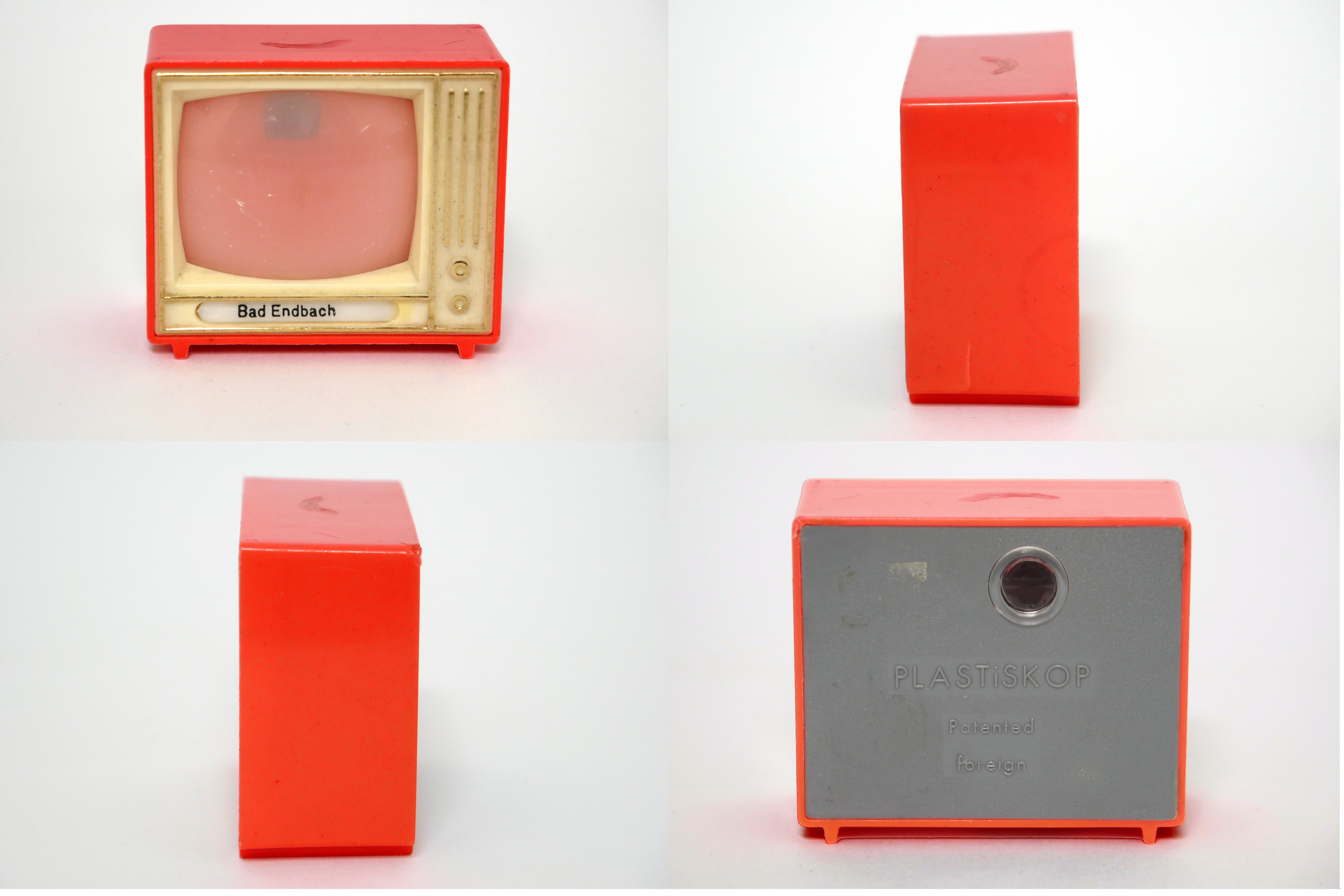 Beschreibung: Modell eines Röhrenfernsehers aus Plastikteilen in Orange, Hell-/Dunkelchamois und Grau, 4,7 x 5,5 x 2,5 cm (HBT)