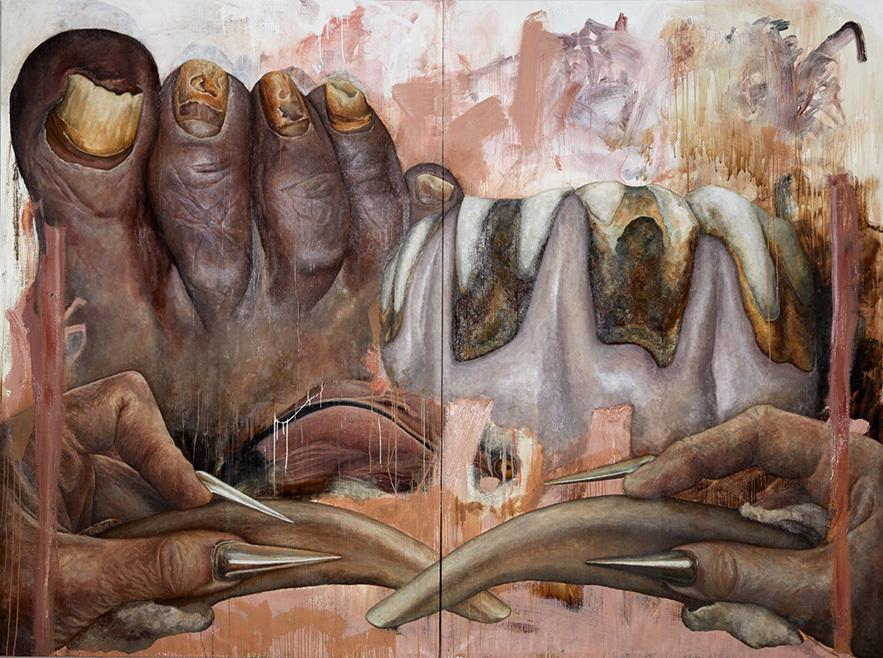 Alle vier Künstlerinnen interpretieren das Medium der Malerei ganz unterschiedlich. Das Konzept einer einzigen Deutung ist ihnen dabei eher suspekt. Man spürt in ihren Werken etwas vom dadaistischen Unruhegeist, von der Unbegrenztheit der Malerei mit einer neo-surrealistischen, teils experimentellen, teils überbordenden Bildsprache. Da gibt es zum einen das radikal erweiterte Verständnis des Mediums im Werk von Kerstin Brätsch, welches installative, skulpturale und performative Seiten umfasst und mit großer Opulenz und Materialsensibilität Ur-Kräfte der Natur versinnbildlicht. Kati Hecks erratische und suggestive Werke erzählen die Geschichten aus dem Freundkreis der Künstlerin in Antwerpen mit Biss und Humor und genuin malerischem Blick – mal hyperrealistisch, dann wieder wie stenografiert. Des Weiteren sehen wir die unorthodoxen Bilder von Laura Link mit ihren wilden, öligen Farbschlieren wie in Badass Nails, das Verdrängtes der Gesellschaft behandelt und schließlich Stefanie Heinzes phantastisch anmutende Bildwelten auf monochromem Grund, die scheinbar vollkommen wild und freigelassen Begegnungen zwischen organoiden Formen etwa einer Mirabelle, einer Niere oder einem Hoden in grelle farbliche Effekte übersetzt.