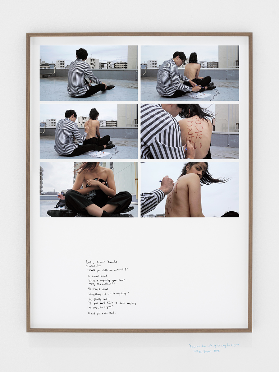 Ja, mit Yusuke, er ist auch in der Ausstellung zu sehen. Er ist der Typ, der auf meinen Rücken »Ich habe nichts zu sagen. Ich habe Dir nichts zu erzählen« geschrieben hat, was dann zum Titel meiner Serie wurde. Mit ihm ist kein Gesprächsfluss entstanden. Um zu vermeiden, dass das Zusammentreffen ein kompletter Fehlschlag wird, bin ich mit ihm aufs Dach gegangen in der Hoffnung eine andere Ausdrucksform zu finden, da unserem Gespräch offensichtlich die Chemie gefehlt hat. Ich habe ihm den Pinsel gegeben und er schrieb dann diesen Satz auf meinen Rücken. Und in dem Moment nahm die Begegnung eine positive Wende – wir wurden nicht beste Freunde – aber immerhin.