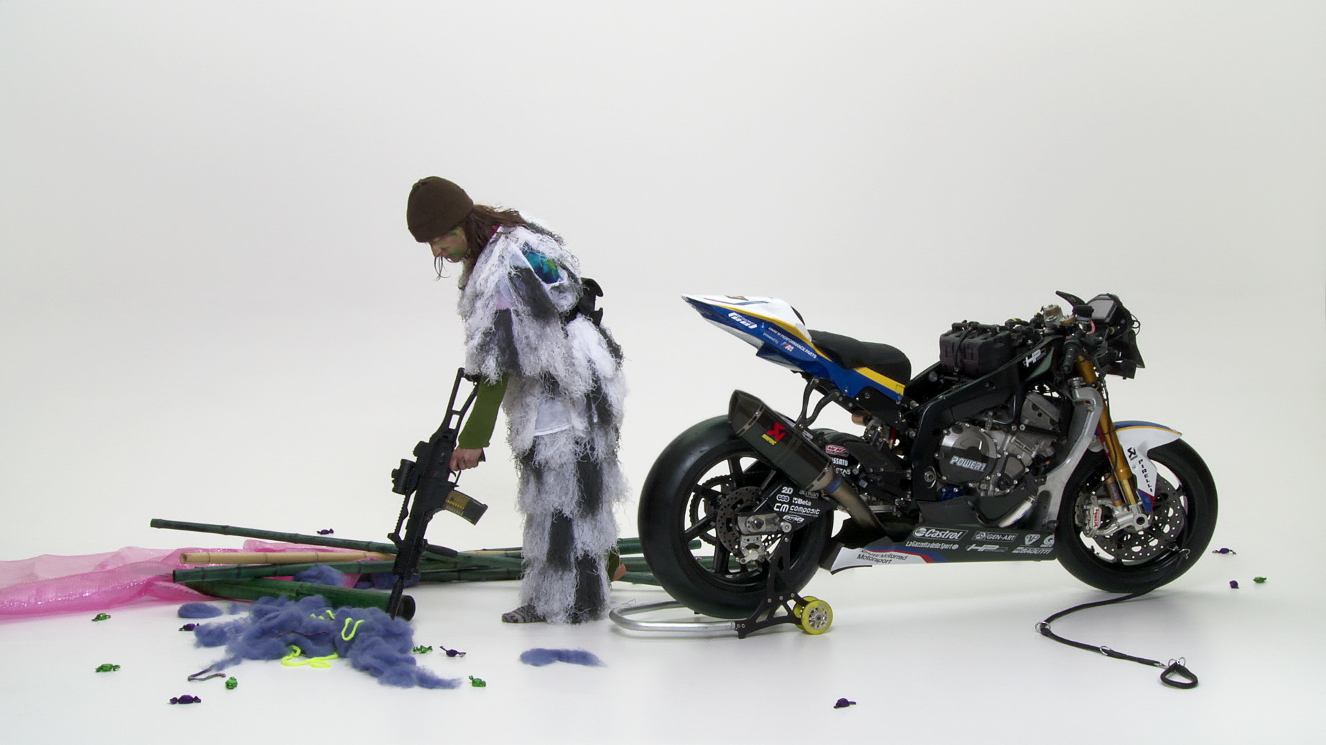 Okay: Ein abgestripptes Superbike, ein verwirrter Hund und ein traumatisierter Partisane im raumlos transzendierenden Weiß eines Film- oder Fotostudios. Celebrity News, Ebay-Auktionslisten, ein wilder Traum mit verbrannter Shopping Mall, Pferden und Insekten, die in Zeitlupe zu Pixel-Fragmenten explodieren.