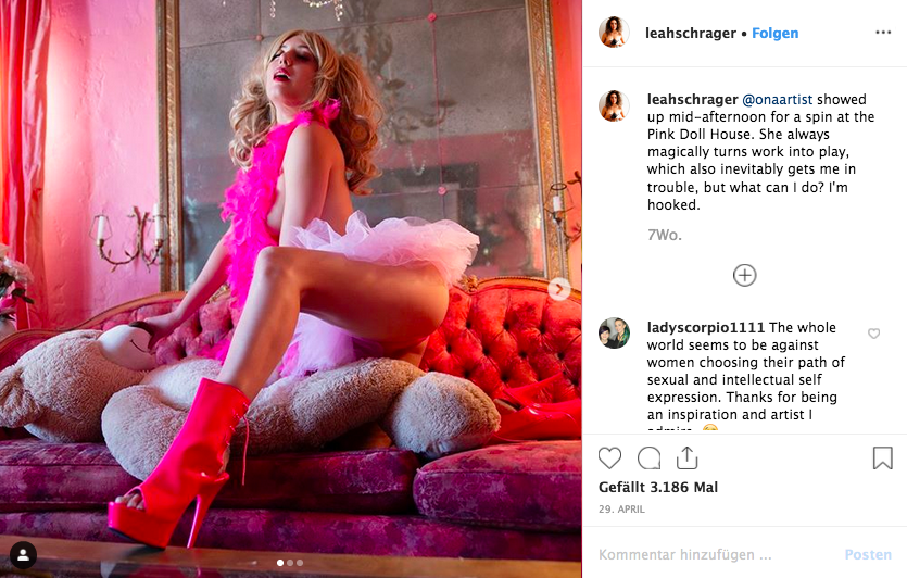 Er investiert eine Million Dollar in sie und ihre Kunst, ein Jahr lang will er versuchen, sie aufzubauen. Er trifft die Entscheidungen, wählt Locations, Fotografen und Bilder aus. Schrager dokumentiert ihr neues Leben auf Instagram, sie nennt ihn Man Hands, Männerhände, und gesteht sich damit das eigene Scheitern ein. Noch vor zwei Jahren war sie sich sicher, dass sie Erfolg haben kann, ohne sich in die Hände eines Mannes begeben zu müssen. Jetzt lässt sie einen reichen Mann für sich entscheiden, was für den weiblichen Blick angemessen ist. Vielleicht sind diese Ereignisse Teil des Werkes der sexpositiven Performancekünstlerlin Leah Schrager. In jedem Fall erinnert sie eindrücklich daran, dass die Geschichte der Kunst die Geschichte des mächtigen weißen Mannes ist.