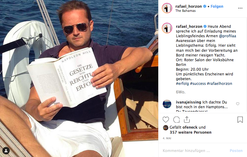 Andy Kassier derweil ist nicht der einzige männliche Künstler, der sich in seinem Erfolg sonnt und gar nicht genug darüber reden kann, wie reich und mächtig und erfolgreich er ist. Rafael Horzon, Schriftsteller, Unternehmer und berühmtester Möbeldesigner in Berlin-Mitte, kann gar nicht oft genug in seinen Instagram-Stories zeigen, wie viele Regale er wieder verkauft hat, wie viele Bilder Sammler ihm abgekauft haben, wie schön eine Reise ist. Und dann ist da noch Andy Picci in Paris, der der kleine Bruder von Andy Kassier sein könnte. Während sein großer Bruder erfolgreich Geschäftsmann ist, streift er durch die Modewelt, macht Werbung für dieses Modelabel, geht eine Kooperation mit jenem Modelabel ein und ist immer mal wieder auf Magazintiteln zu sehen. Natürlich ist auch hier alles erfunden, aber das muss der Follower erst einmal durchschauen.