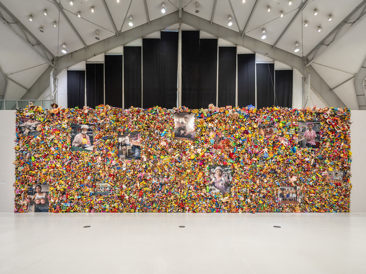 Auch Michael Wolf ließe sich auf den ersten Blick in diese Reihe einordnen. Seine Arbeit The Real Toy Story besteht aus großen Wandinstallationen, auf denen er in einer Länge von 23 Metern und einer Höhe von 4,5 Metern einen dichten Teppich aus Fotos und über 20.000 Spielzeugen »made in China« arrangiert. Auch er verwendet die Industriegegenstände als Künstlermaterial, auch er greift auf die knallbunte Plastik-Faszination zurück. Doch diese Ästhetik steht nicht für sich alleine. Porträtfotografien der chinesischen Fabrikarbeiter*innen und Dokumentationen ihrer Arbeitsbedingungen kontrastieren das Ambiente. Michael Wolf zeigt das ernüchternde Making Of der Lieblinge unserer Kindheit.