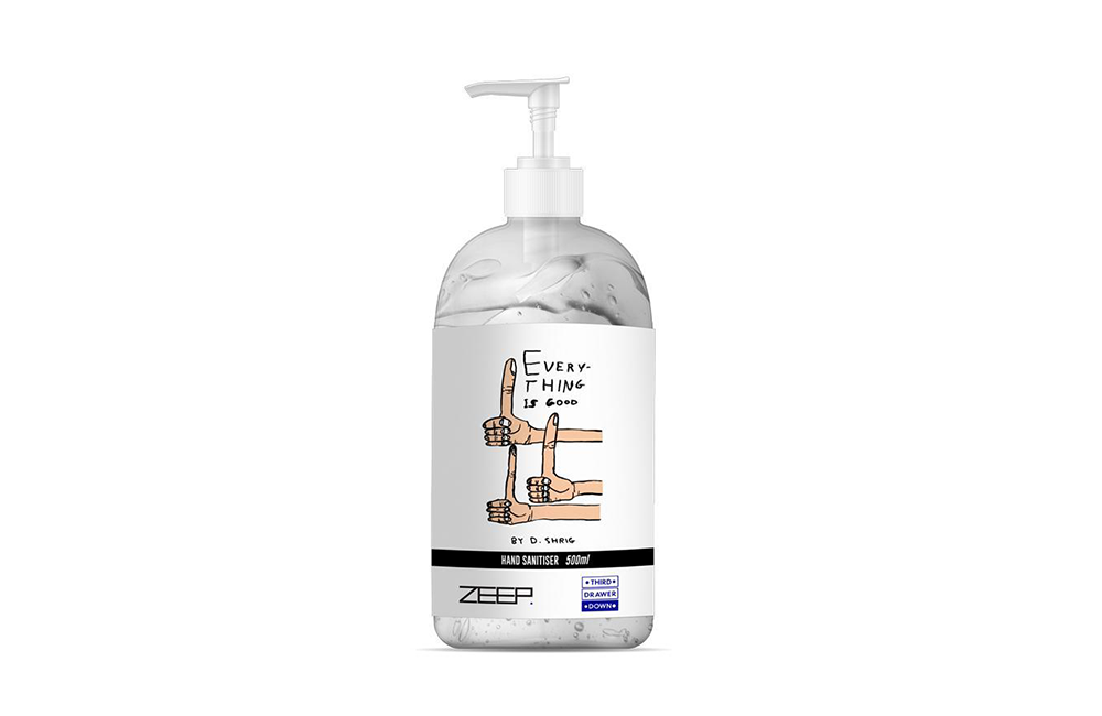 Dabei handelt es sich, passend zur Empfehlung, um Desinfektionsmittel für die Hände, und die Behälter – in zwei verschiedenen Größen – wurden mit Motiven von David Shrigley und Magda Archer gestaltet. Für neue Entwürfe hat die Zeit aber offenbar nicht gereicht, vielmehr wurden ursprünglich für andere Zwecke konzipierte Bilder und Slogans wiederverwertet.